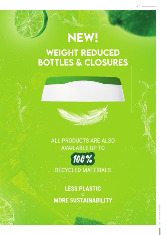 47 NEw! wEighT REDucED BOTTLES & cLOSuRES BOTTLES & cLOSuRES ALL PRODUCTS ARE ALSO AVAILABLE UP TO RECYCLED MATERIALS LESS PLASTIC = MORE SUSTAINABILITY SHB PACKAGING - 2025