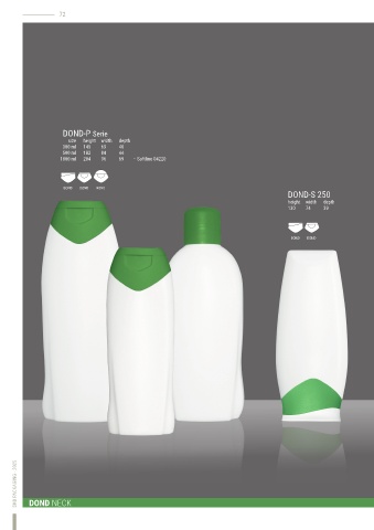 72 72 DOND-P Serie size height width depth 300 ml 145 69 40 500 ml 182 84 44 1000 ml 204 96 69 – Softline 04220 BOND DOND ROND DOND-S 250 height width depth 130 74 39 BOND DOND SHB PACKAGING - 2025 DOND NECK